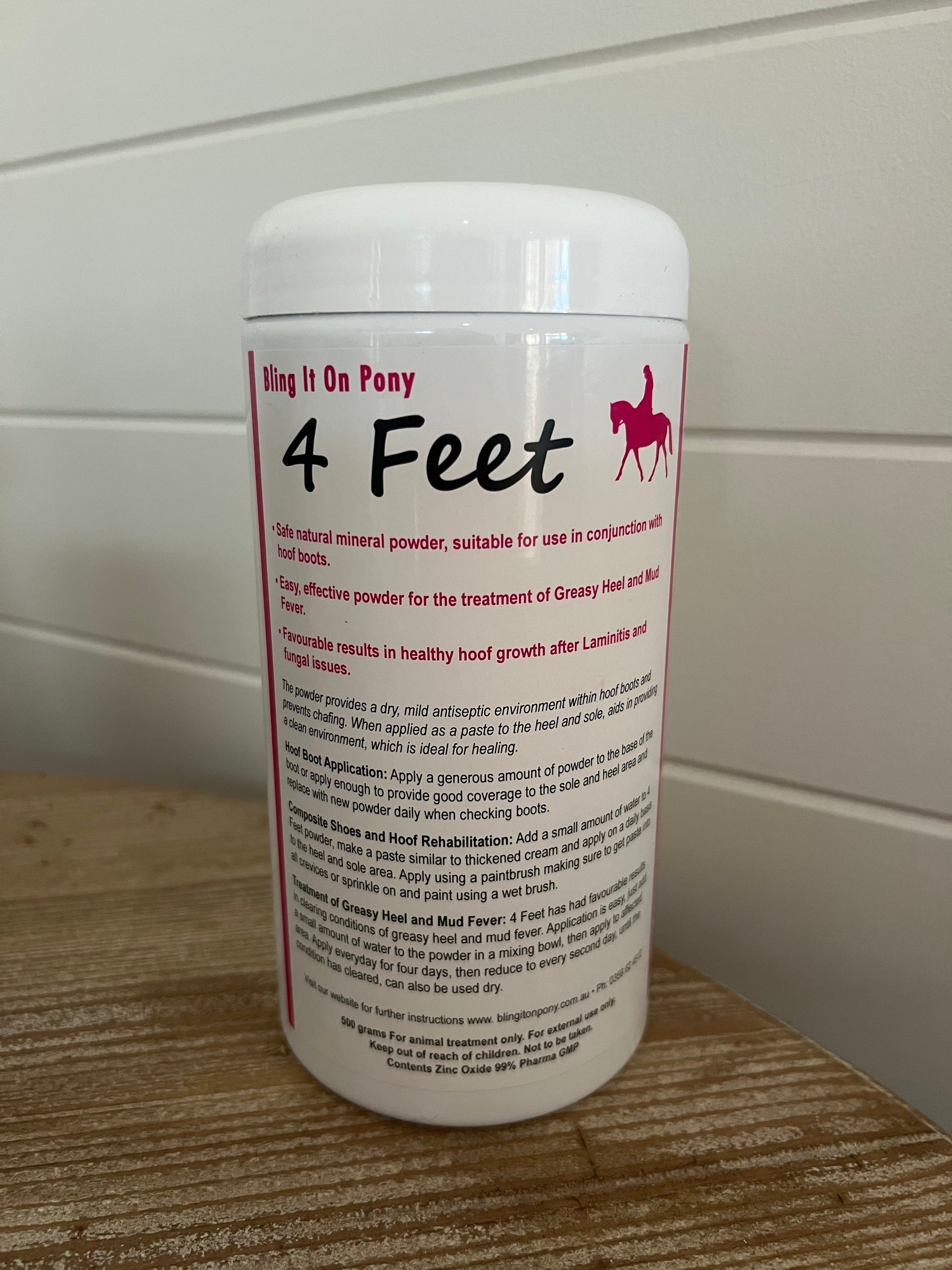 Easy, effective powder for the treatment of Greasy Heel and Mud fever. 4 Feet has had favourable results in clearing conditions of greasy heel and mud fever. Application is easy, just add a small amount of water to the powder in a mixing bowl, then apply to affected area. Apply everyday for four days, then reduce to every second day, until the condition has cleared, can also be used dry.
