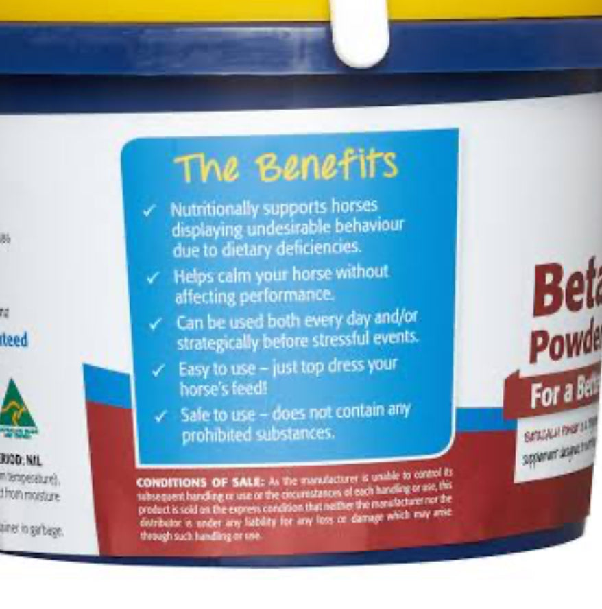 BetaCALM is a Tryptophan, Thiamine, Vitamin E and Magnesium supplement designed to nutritionally support nervous and anxious horses.