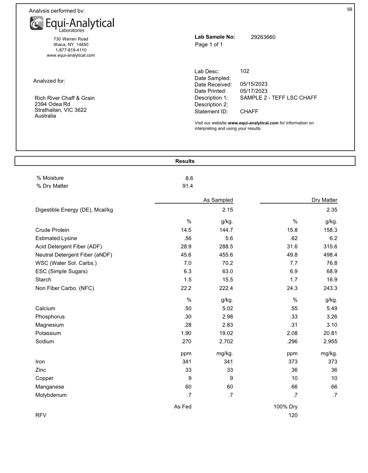 A feed tested teff/ lucerne chaff blend suitable for horses and ponies that are prone to laminitis, founder, Cushing disease and are insulin resistant.