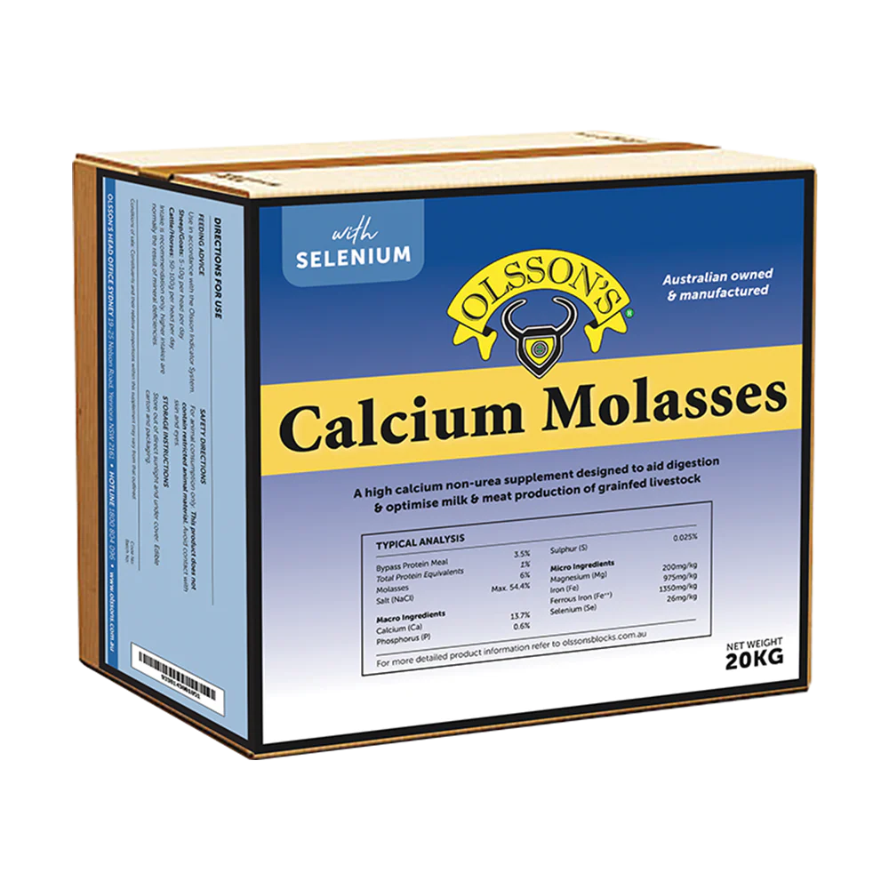 Olsson’s Calcium Molasses is a nutritional supplement formulated for cattle, sheep, goats, and deer on grain-based diets. This block provides calcium and protein to support digestion and help maintain a balanced calcium-to-phosphorus ratio in grain-fed animals. Adequate calcium intake is important in managing the risks associated with lambing sickness and milk fever. Grain-based diets can be low in protein, minerals, and vitamins, which may affect digestion and feed efficiency. Olsson’s Calcium Molasses is designed to help address these imbalances as part of a well-managed feeding program.