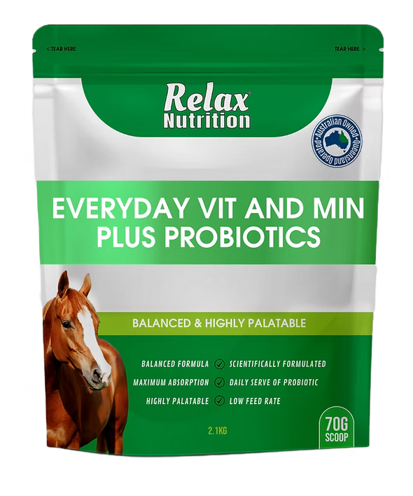 Relax Everyday Vit & Min plus Probiotics provides your horse with their daily vitamins and mineral requirements plus adding the benefit of a probiotic for increased gut health.
