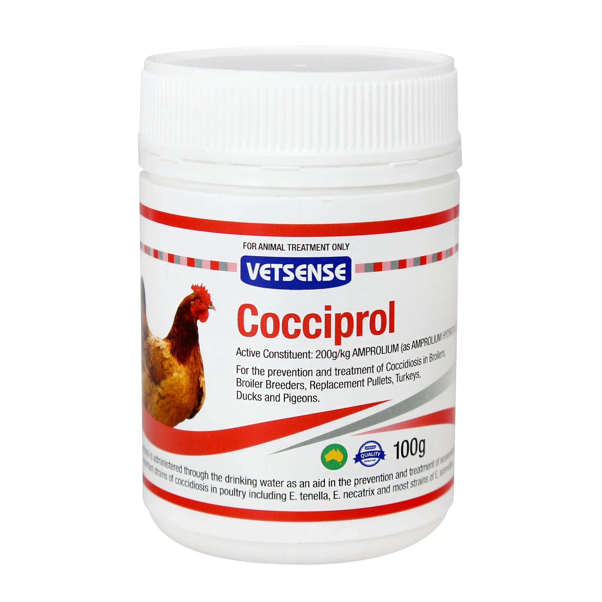 Vetsense Cocciprol is administered through the drinking water as an aid in the prevention of economically important strains of coccidiosis including E.Tenella, E.Necatrix and most strains of E.Acervulina.